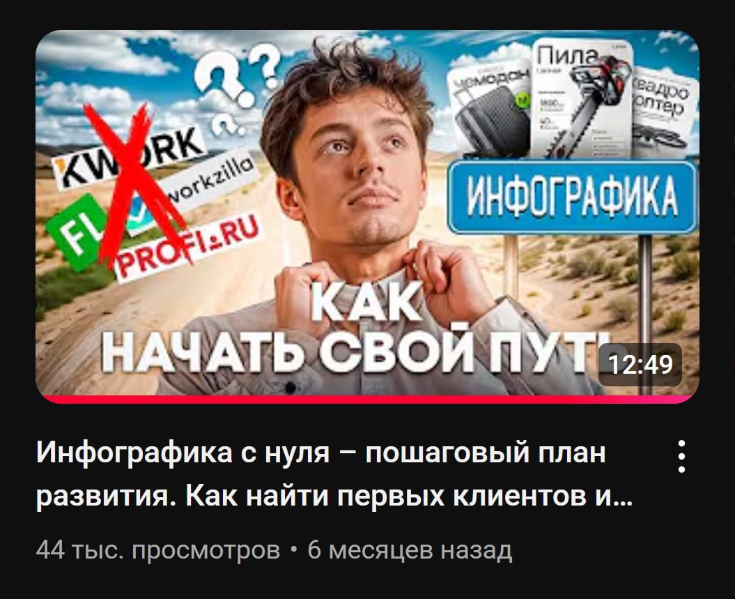 Недавно приятно удивился 🫰 44.000 просмотров на ютубе, чувствую себя блогером! А представляете еще) Забрал важную ачивку: Если в поиске на YouTube вбить в поиск "Инфографика", то я там буду всегда на первой позиции 😎 — Думаю, пора бы возобновить карьеру на ютубе... Кто не видел это видео, гляньте, особенно начинающие