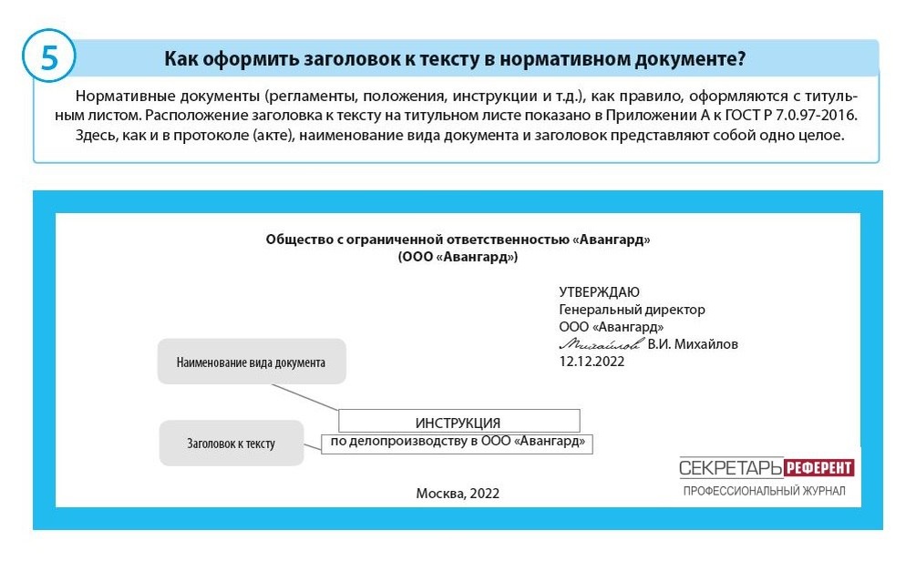 Дарим шпаргалку от журнала "Секретарь-референт"! Присылайте ваш e-mail с пометкой "заголовок к тексту" в сообщения группы: @profimanagerop Узнаете, в каких НПА установлены требования к реквизиту «Заголовок к тексту», а также как оформить заголовок к тексту в приказе, письме, протоколе, акте и нормативном документе. Скачать статью на сайте