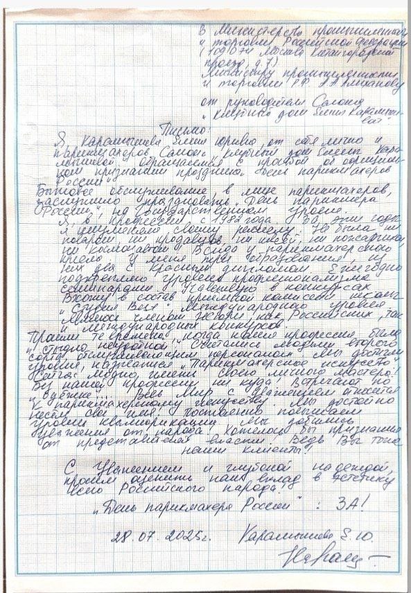 Министерство промышленности и торговли РФ Министру Алиханову А.А. От: Карамышевой Елены Юрьевны (Лично и от парикмахеров салона «Клубный дом Лены Карамышевой») Обращение с просьбой о признании Дня парикмахера России Уважаемые представители власти! Я, Карамышева Елена Юрьевна, в профессии с 1982 года. За эти годы я своему ремеслу не изменяла: не была ни поваром, ни продавцом, ни швеёй, ни пожарным, ни космонавтом. Всегда шла только этим путём. Мой профессиональный путь: • 3 образования (из них 2 высших с красным дипломом), • Ежегодное подтверждение уровня на семинарах, • Участие в конкурсах международного уровня (студия «Беста»), • Член жюри российских и международных чемпионатов, • Член приёмной комиссии в парикмахерской школе. Наша профессия сегодня — это искусство! Прошли те времена, когда парикмахерское дело считалось «стыдным», неудобным, а мы — «обслуживающим персоналом второго сорта». Сейчас всё иначе: → Нас называют художниками, → Модно иметь «своего мастера», → Без нас — н