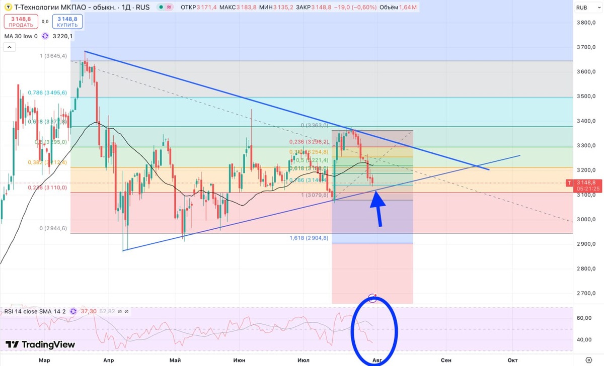 Тинёк движется в треугольнике и нижняя грань выглядит как магнит для цены. Возможно там будет хорошая точка входа 🤞 Фундаментально у бумаги всё хорошо. Да и RSI уже нормально остыл.