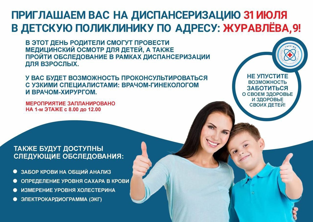 Завтра, 31 июля, в детской поликлинике на ул. Журавлёва, 9 с 08:00 до 12:00 пройдет диспансеризация. Это возможность пройти медосмотр и детям (с 1 месяца до 1 года), и взрослым. В этот день будут проводиться различные обследования: забор крови на общий анализ, определение уровня сахара и холестерина в крови, электрокардиограмма. Взрослые жители смогут получить консультации от узких специалистов (врач-гинеколог и врач-хирург).