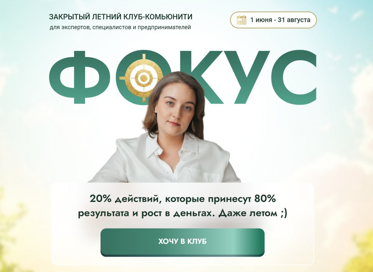 Завтра в последний раз дадим возможность попасть в закрытый летний клуб для экспертов, специалистов и предпринимателей "Фокус" 🥳 Мы с ребятам работаем там уже 2 месяца под моим руководством и все подтверждают, насколько подходящий для лета формат получился. С одной стороны, программа на чиле на расслабоне, чтобы можно было и в отпуск съездить, и погулять лишний разок, с другой - шестерёнки процессов крутятся, не останавливаются, так что мы успеваем и продвижением, и продажами заниматься. В августе будет квинтэссенция всего: • Групповая стратсессия с практикой «Ячейки масштабирования: как быстрее всего расти в продажах и подписчиках» • Квест-челлендж «Прорыв» для буста личного бренда. С победителем и вау-призом ;) • Пошаговый план фокусных действий на август, рекомендации для разных ниш и ситуаций • Дни «Вопрос-Ответ» в чате с со мной • Общий чат для поддержки и обратной связи. Разборы сложных моментов + ответы на вопросы, бонусные подкасты • Подведение итогов летнего клуба ——— Ч