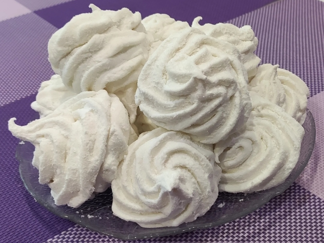 - Соединить белки с оставшимся сахаром и взбить миксером в крепкую пену. Не переставая взбивать, добавить к белкам горячее яблочное пюре. Взбивать на максимальной скорости миксера ещё 5 минут. Масса должна посветлеть, а её объём увеличится примерно в 3–4 раза.