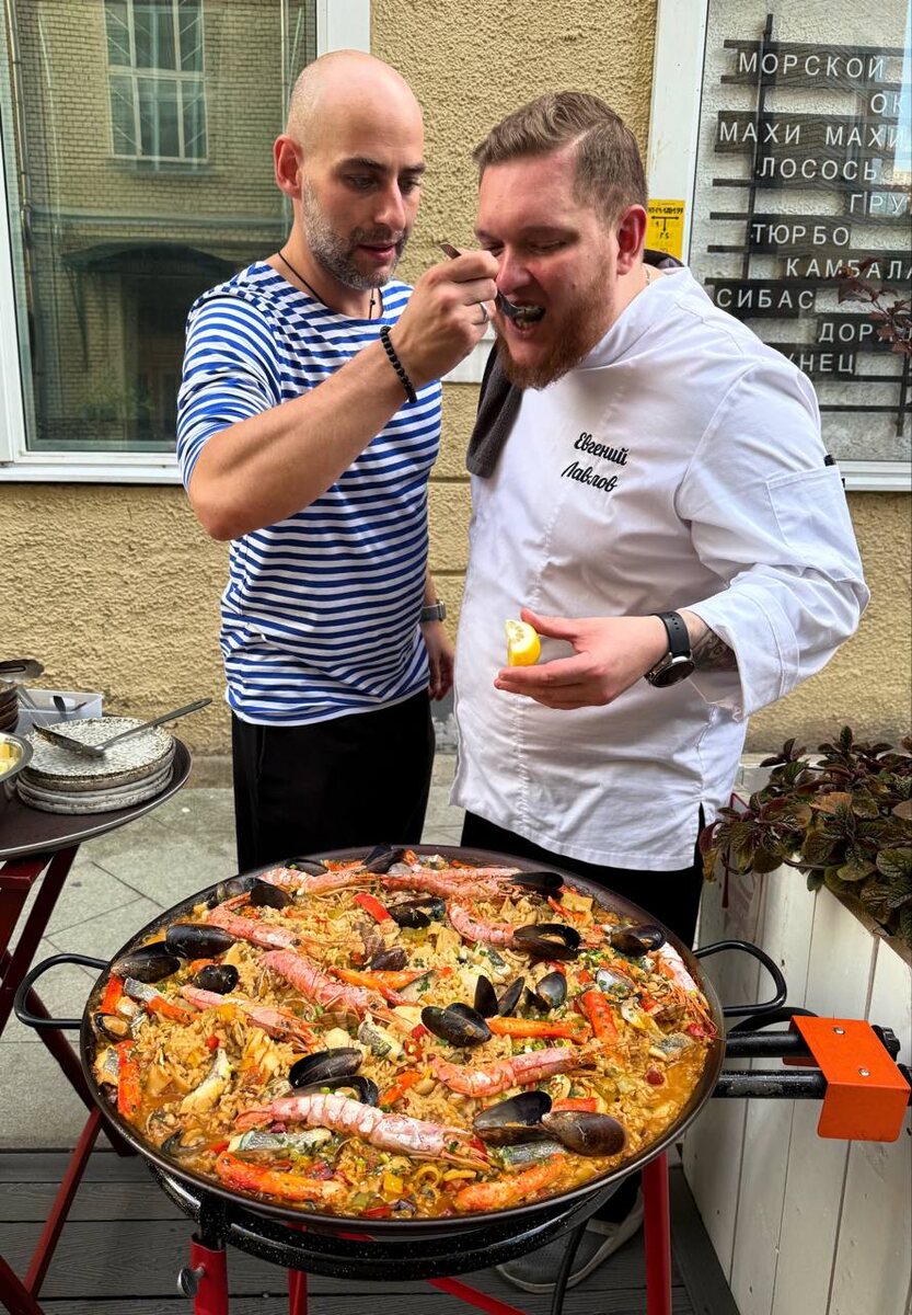 Сегодня в Трёхпрудном «Рыбторг» гуляет свой 8 день рождения – Антон Тихий готовит паэлью с морепродуктами прямо на улице, а ресторатор