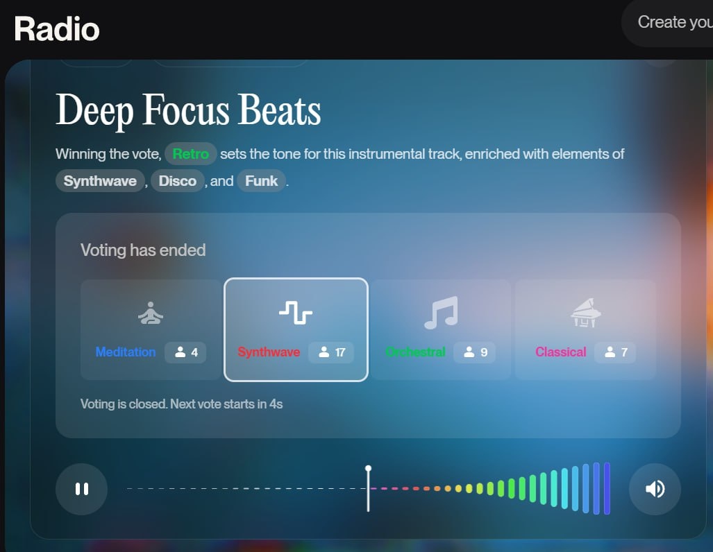 Теперь у Suno есть свой онлайн-радио, где 24/7 играют только треки, сгенерированные ИИ. Без каверов, ремиксов и чужих голосов — только оригинальная нейросеточная музыка, созданная пользователями.