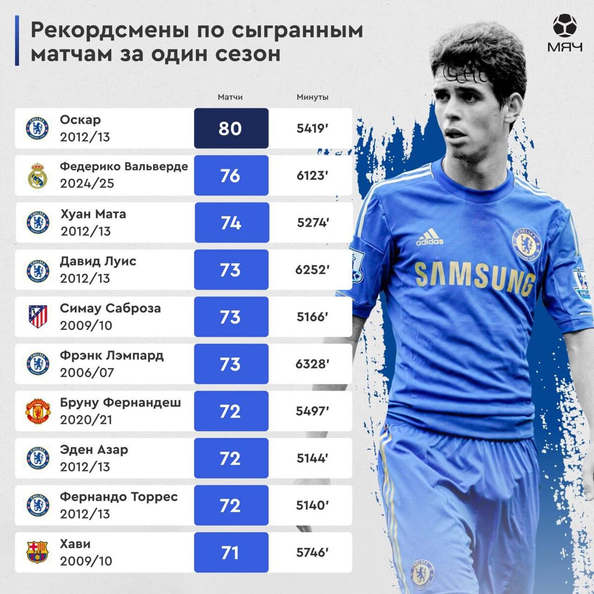 🇨🇳🏴Лучший игрок прошлого сезона китайской Суперлиги является футболистом, сыгравшим больше всего официальных матчей в течении одного сезона Оскар вышел на поле в 80 играх в сезоне-2012/13 в составе Челси. Компанию ему в топ-10 составляют еще 4 партнера по команде. Связано это с тем, что тогда лондонцы, помимо английских соревнований, выиграли ЛЕ, а также играли в финале КЧМ. Плюс бразильские и испанские игроки «Челси» прошли путь до финала Кубка Конфедераций, где победила Бразилия. В этом же сезоне больше всех набегал Феде Вальверде - 76 игр (6123 минуты).
