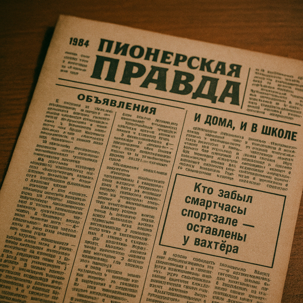 В выпуске “Пионерской правды” за 1984 год закралось объявление: “Кто забыл смартчасы в спортзале — оставлены у вахтёра”