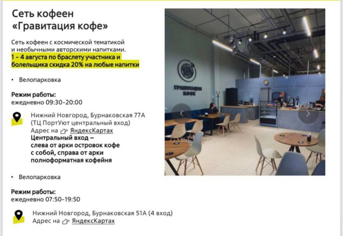 если кто-то участвует в IRONSTAR NIZHNY NOVGOROD 2025, то по браслету участника можно получить у нас 20% скидку на напитки я рад, что связь кофеен и спорта становится всё более популярной (чего только стоит Питерский Старт) всё меньше кофе ассоциируется с сигаретой, всё больше – со здоровым образом жизни