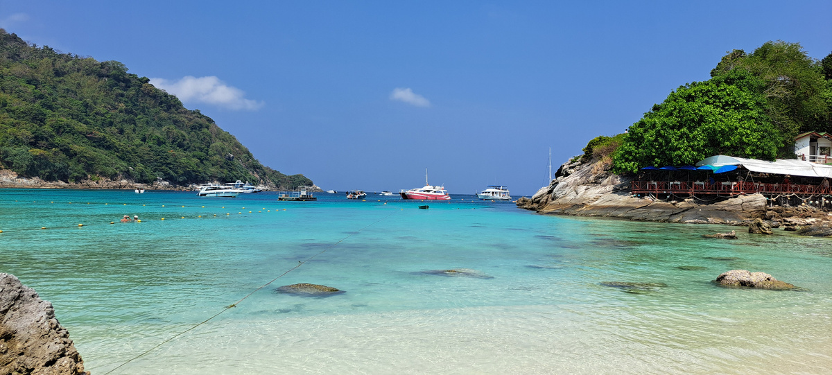 Ещё одна экскурсия по островам, которая нам очень понравилась-это посещение островов Рача(или остров рая) и Корал. Так как было время выспаться, с утра мы успели позавтракать вот такой вкусняшкой из 7/11, очень рекомендую, так как она намного вкуснее любого дубайского шоколада! Затем за нами к отелю приехал минивэн. Мы приехали в порт Чалонг, где опять же для всех желающих предлагалось бесплатно кофе, чай и печеньки. Был магазин и туалет. Спустя минут 20 мы отправились в море на спидботе. Очень весело, иногда экстримально , спустя минут 40 мы добрались до первого острова-Рача. Это экскурсия-релакс, где вы весь день отдыхаете на белоснежных песках и купаетесь в лазурной водичке. Мы прибыли на остров, когда людей ещё было совсем мало. Кто хотел поснорклить, те остались в лодке, а мы вышли на берег, так как предпочли погулять по острову в это время. Поэтому первым делом, сделав пару снимков пустынного пляжа мы отправились на смотровую. Смотровая находится на камнях, за кафе. На смотров