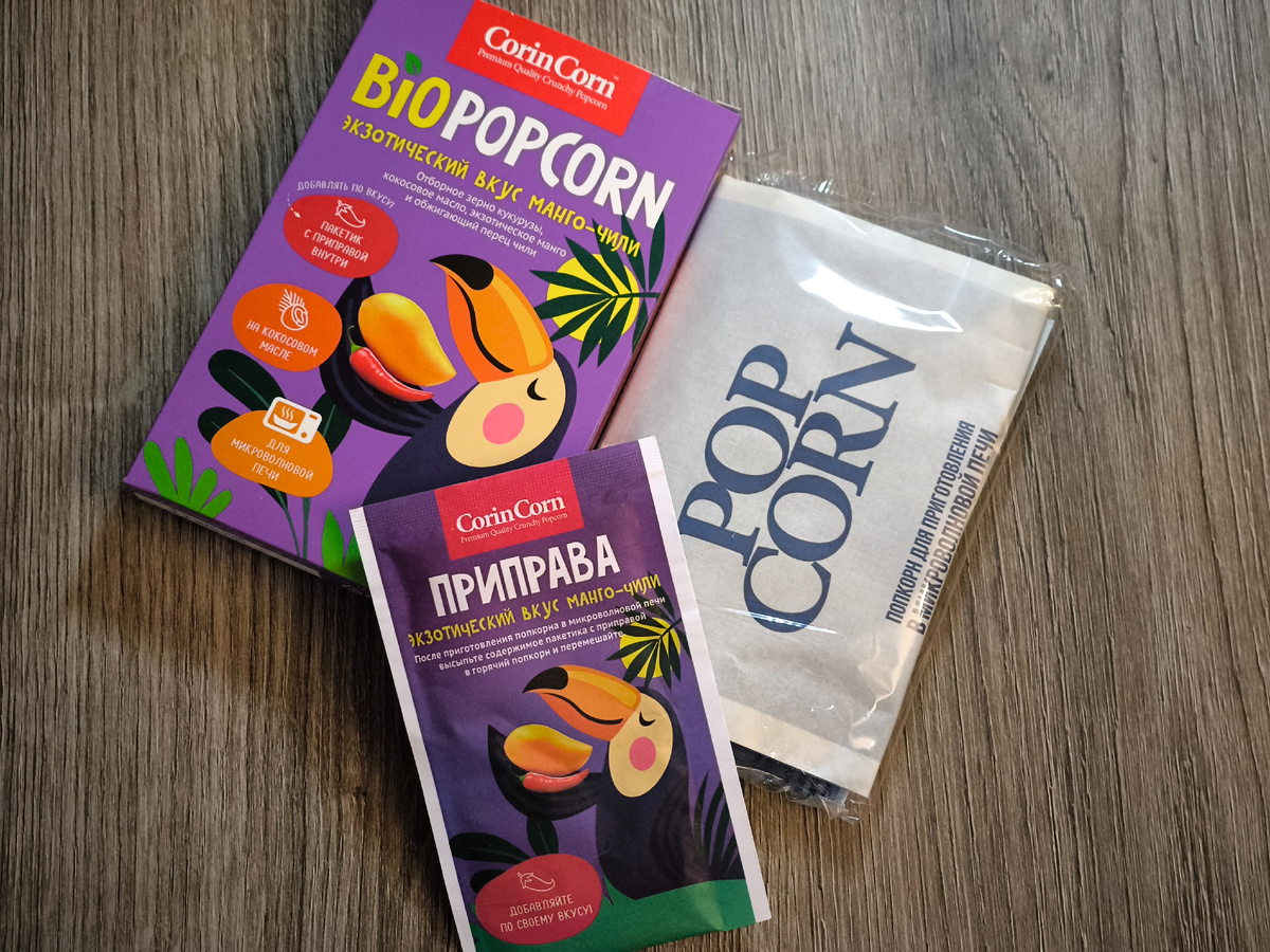 Что может быть лучше, чем уютный вечер перед телевизором за просмотром хорошего фильма? Только снеки, которые мы поглощаем во время этого самого просмотра. Уже не первый раз встречаю именно такое сочетание вкусов - "Манго - Чили". Как - то нам попались жевательные мармеладки, по моему от "Бон Пари", По вкусу они оказались изумительные - острые и сладкие одновременно. Поэтому увидев на полке в магазине такой чудо поп корн, решили попробовать и эту новинку. В составе продукта - зерно кукурузы, масло растительное кокосовое, соль пищевая, жир растительный специального назначения. Пищевая ценность на 100 г продукта: Энергетическая ценность/ калорийность на 100 г продукта - 2114,3 кДж/ 505,1 кКал. В составе приправы "Манго - чили" - декстроза, сахар, молочная сыворотка, соль пищевая поваренная, паприка красная молотая, усилитель вкуса и аромата - глутамат натрия (Е621), ароматизаторы натуральные, луковый порошок, перец красный молотый, перец черный молотый, имбирь, кардамон, лимонная кисло
