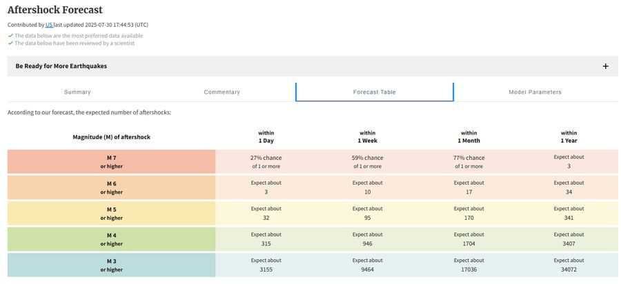 Прогноз афтершоков на полуострове Камчатка, Россия, 2025 г. от Геологической службы США