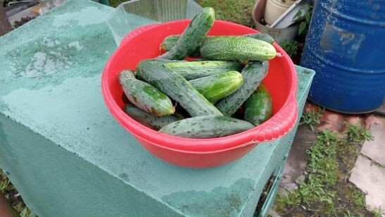 Здравствуйте дорогие друзья и гости моего канала. Делюсь с вами новостями с полей, т.е. с нашей любимой дачки. Огурцы пошли... и собираем их тазиками. Вот такой красный тазик мы собрали с грядки огурцов в грунте. Осталась рассада огурцов, я долго носилась с ней по огороду не знала куда пристроить, пристроила. И получилась вот такая небольшая грядочка, 10 корней. Они долго сидели под пленкой, на фото видны дуги для пленки. А сейчас без пленки, июль все же. Подрастают небольшие огуречки. При сборе огурцов применяем наше с вами золотое правило: нет огурца, нет листа. Что интересно, у огурчиков в грунте бочок, который лежит на земле желтенький, ему не хватает света. Вот они такие светлопузенькие получаются. И, конечно, в грунте более ароматнее чем в теплице, как и помидоры в прочем тоже. Ну, а сейчас переходим на сбор огуречков в теплице. Это вот Зозули в теплице. Зозулям виват! Как всегда радуют урожаем, быстро плодоносят, их много на кусту, у них прекрасный вкус. А вы знаете, что Зозул