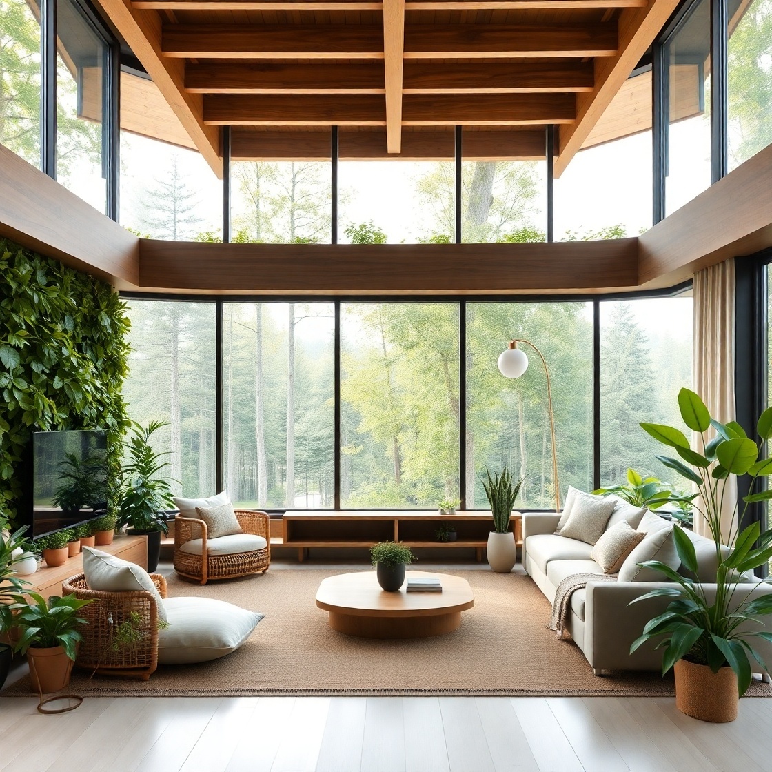 Гостиная с видом на лес, где деревянные балки, мягкие текстуры и множество растений создают ощущение единства с природой. Что это: Экостиль — это не просто про деревянную мебель и натуральные ткани. Это философия ответственного потребления и использования устойчивых решений в архитектуре и интерьере. Как реализовать: Пример: