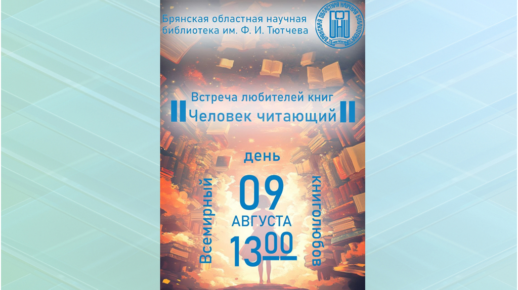 В Брянской областной научной библиотеке им. Ф. И. Тютчева состоится встреча любителей книг «Человек читающий». Она пройдет 9 августа в 13:00. В этот день отмечается Всемирный день книголюбов. Главная цель праздника - стимулировать интерес к чтению и культуре книги, повысить грамотность и распространить знание.