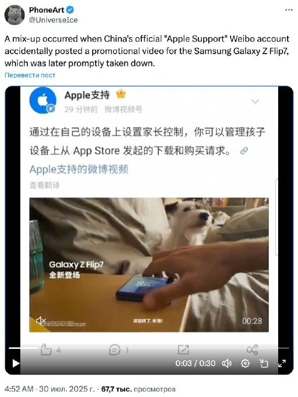 Маркетинговый стыд недели: Apple случайно прорекламировала Samsung На официальной странице Apple в китайской соцсети Weibo (аналог Twitter) внезапно появился рекламный ролик… Samsung Galaxy Z Flip7. Не новый iPhone, не свежая iOS, а раскладушка главного конкурента 😳 Пост быстро удалили, но интернет, как всегда, все помнит По предварительной версии, ошибку допустило местное рекламное агентство, которое ведёт соцсети сразу для двух брендов. Так что если вам сегодня кажется, что день не задался — просто вспомните smm-специалиста, который случайно выложил Samsung от имени Apple 🥴 #маркетинговыйстыд@bukhalovabrand