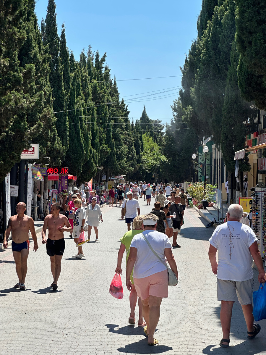 Нам часто пишут в комментариях, что летом в Судаке не протолкнуться, как говорится «ни вздохнуть ни испустить газы». Мы были летом прошлого года и находили себе места на пляже. Да, народу много, но пляжная карта большая, набережная тоже, так что где-то можно найти местечко. Давайте посмотрим, как обстоят дела в этом году. Это мы 31 июля в 12:20 шли на пляж, многие уже возвращались обратно. Это был день приезда в Судак и после заселения мы отправились на пляж. Сгореть мы не боимся — мы уже загоревшие и не обгораем. Тем более мы чувствуем свое тело и если начинает припекать, то понимаем, что нужно идти в тень или хотя бы окунуться, а не продолжать жариться. В общем, что я вам буду объяснять, каждый сам отвечает за себя и свою семью. На пляже в это время места есть, не обязательно же останавливаться около воды. Можно немного дальше, на песочке. Что мы и сделали, а когда перед нами освободилось место, мы передвинулись ближе к берегу. А это уже вечером⬇️: в 17:30 первое фото и в 18:30 втор