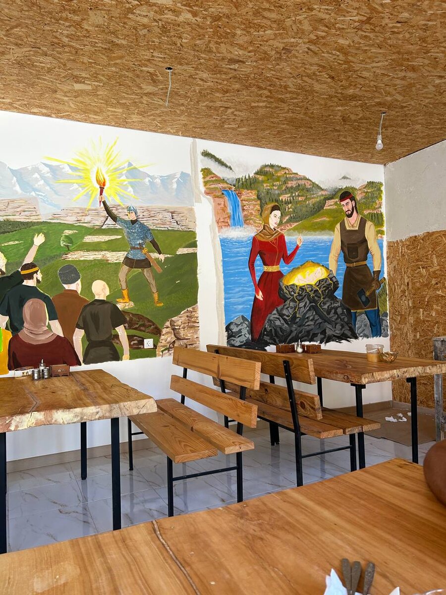 Зашли пообедать в кафе в горах( по дороге в Тызыльское ущелье) и стали свидетелями создания росписи на стенанах по мотивам нартского