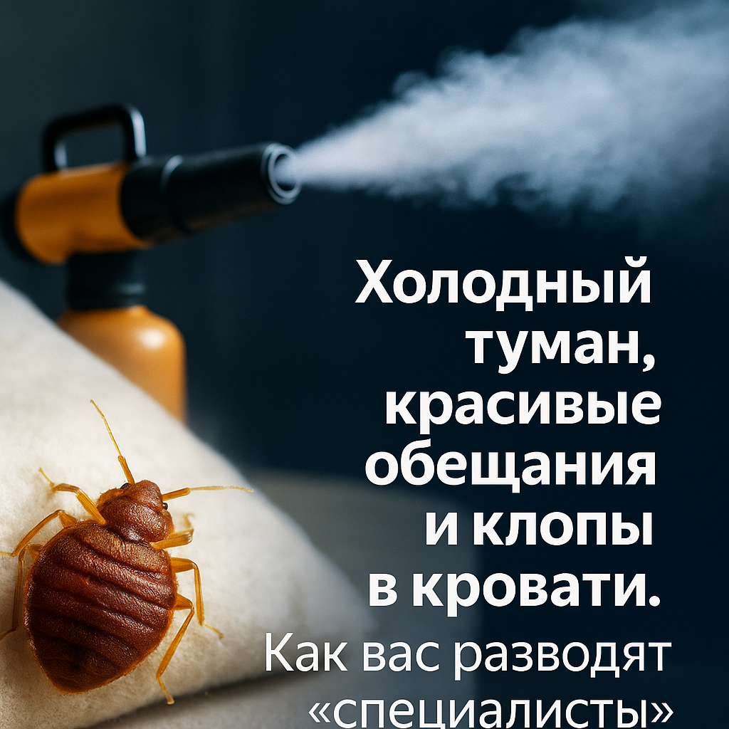 Холодный туман — звучит красиво. А на деле это просто дорогой антураж без результата. Клопы не дураки: сидят в швах кровати и ждут, пока вы выветрите дым. Почему “специалист” делает вид, а вы остаетесь без сна и с укусами — рассказываю по шагам и на реальных кейсах. Если вам это знакомо — вы не одни. Почти каждый третий мой клиент — это те, кто уже заплатил кому-то и остался ни с чем. Кровь течёт, клопы живут, а кошелёк пуст. Почему? --- Вот в чём вас обманывают. Холодный туман — это не волшебное оружие, а просто способ распыления. Как аэрозоль. Как дезодорант. Что в баллоне — вот что важно. А часто в нём — дешёвая отрава с минимумом действующего вещества. Если клоп сидит: - под швом кровати, - в изголовье, - внутри прикроватной тумбы, - за плинтусом, - в стыке гипсокартона и пола, — он не почувствует ваш “туман” вообще. Он не вылезет, не вдохнёт, не погибнет. Он выждет. И выползет ночью на ужин — на вас. --- Случай №1: женщина заплатила 16 500 ₽ за туман, ей пообещали «экологичный