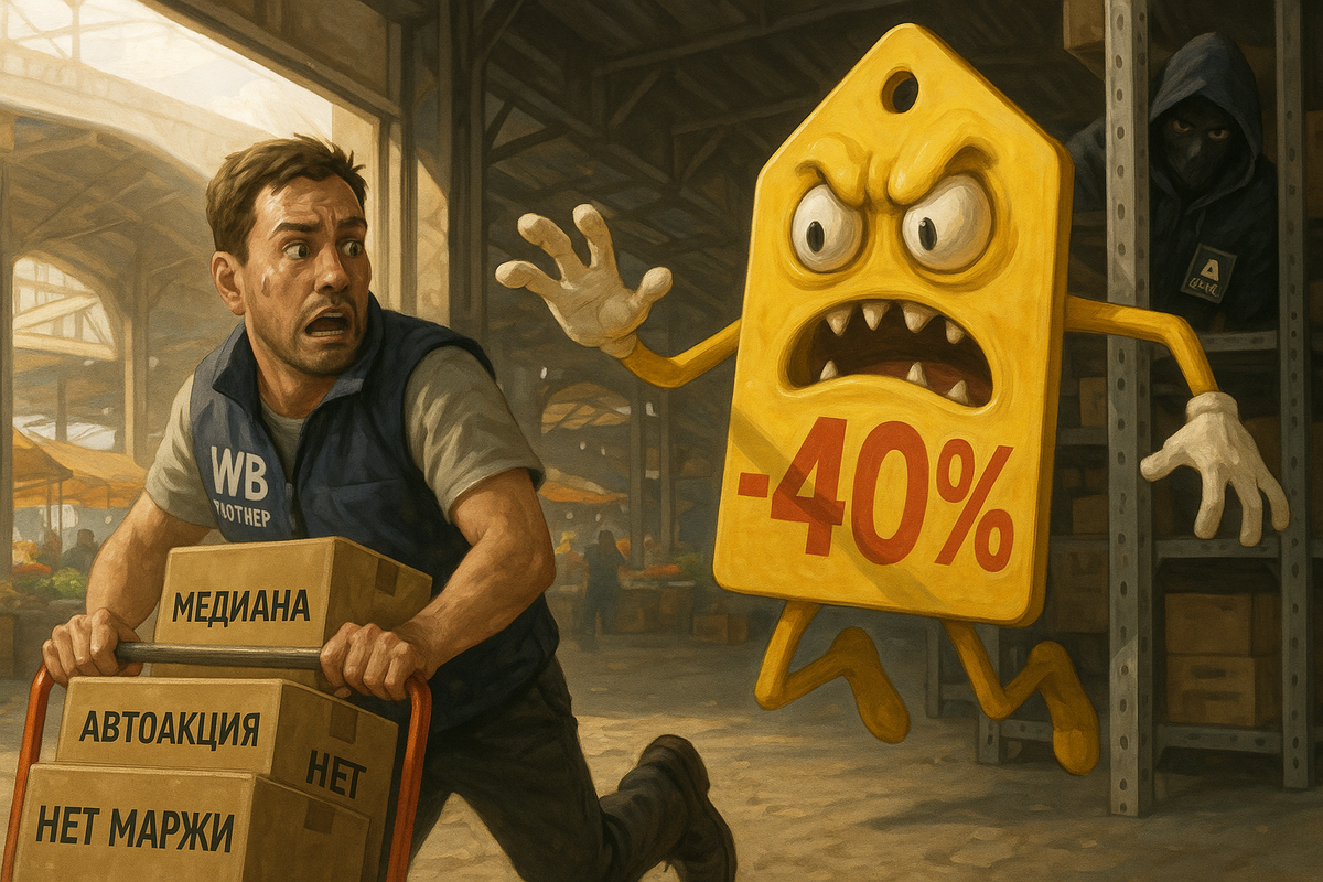 Если участвовать в акциях постоянно, медианная цена падает. А значит — маркетплейс будет предлагать всё меньший потолок для участия в следующих промо. Поднять цену резко уже нельзя — просто перестанут покупать. Получается замкнутый круг: выйти из него можно только с новой карточкой или с новым товаром.