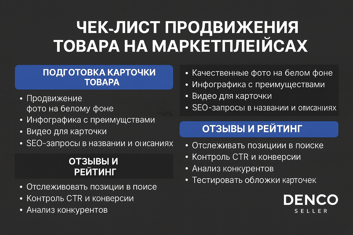 Если забыли про упаковку — рейтинг упадёт. Мы в DENCO Seller подготовили экспертный чек-лист на основе опыта с десятками категорий, партнёров и аналитики. Берите в работу или сохраняйте. Перед любым продвижением — качество карточки. Если этого нет, реклама работать не будет. Что нужно: 💡 Совет: используйте MPStats или Moneyplace для подбора ключей, отслеживайте, как ищут товар реально. Когда карточка готова — запускаем продвижение: ⚠️ Если CTR < 2% — меняйте обложку и заголовок В 2025 году одна внутренняя реклама — не спасёт.