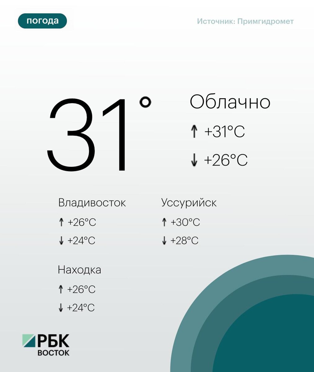Сегодня погоду в Приморье определяют фронтальные разделы. Местами кратковременный дождь, в отдельных районах гроза. Ветер южный умеренный. Температура воздуха днём +26...+31°C 🌧 Во Владивостоке облачно, утром дождь. Ветер юго-восточный умеренный до сильного. Температура воздуха днём +24...+26°C. 😃Подписывайтесь на РБК Восток