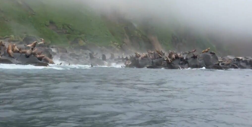 Десятки сивучей покидают лежбище на фоне падающих камней и бушующих волн на Курилах из-за землетрясения