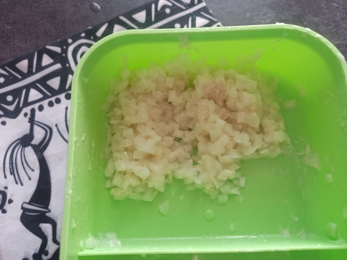- Нарезаем лук кубиками — не мельчим, пусть прикусывается с характером.