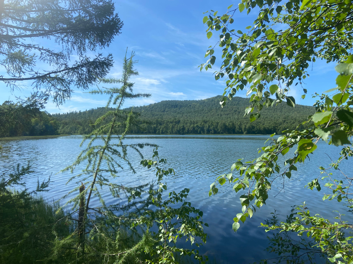 Окружено: со всех сторон озеро окружено смешанным лесом (сосна, лиственница, берёза). Высокие лиственницы и берёзы подступают прямо к воде.