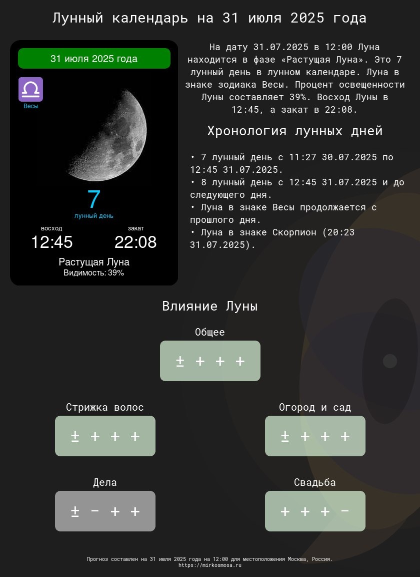 Лунные календари на 31 июля 2025 года: Подготовьтесь к этому дню с учетом влияния Луны! 🔹🌗 Лунный календарь на 31 июля 2025 года — Что приготовила Луна? Подробнее 🔹✂️ Лунный календарь стрижек на 31 июля 2025 года — Подходящий ли день для обновления прически? Подробнее 🔹🌱 Лунный календарь огородника и садовода на 31 июля 2025 года — Лучшее время для ухода за растениями. Подробнее 🔹📅 Лунный календарь дел на 31 июля 2025 года — Удачные моменты для важных задач. Подробнее 🔹💍 Лунный календарь свадеб на 31 июля 2025 года — Подходит ли этот день для вашего торжества? Подробнее