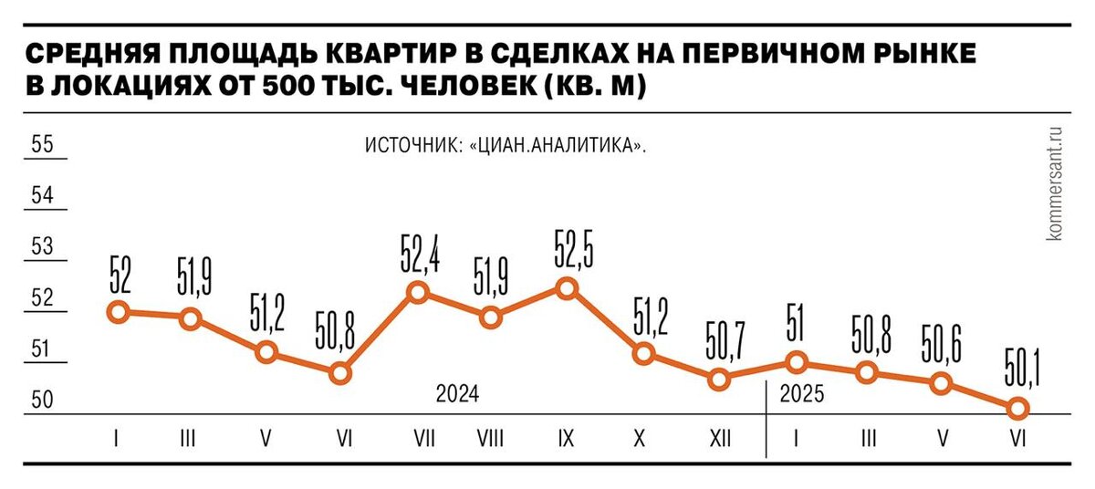 В июле 2025 года средняя площадь проданной квартиры на первичном рынке составила 50,4 м² — на 2% меньше, чем годом ранее. • Девелоперы не стремятся увеличивать метраж, поскольку компактные квартиры по-прежнему востребованы — их доля в продажах достигает 30–40%.13,2K11:42
