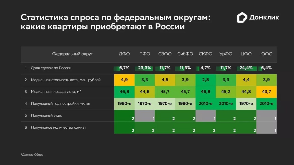 В исследовании учитывались только квартиры. "В 2025 году наибольшее количество сделок было совершено в Центральном федеральном округе (24,4%), вторым, с небольшим отставанием, следует Приволжский федеральный округ (23,3%). Далее разместились Северо-Западный (11,7%), Уральский (11,7%) и Сибирский (11,3%) федеральные округа. Меньше всего покупок квартир на вторичном рынке недвижимости было совершено в Северо-Кавказском федеральном округе (4,7%)".