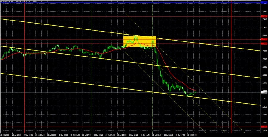 https://basechop.ru/wordpress/?p=51836 Анализ GBP/USD 5М. Валютная пара GBP/USD в течение среды также продолжала нисходящее движение. По тем же причинам, что и пара EUR/USD. Американская экономика во втором квартале выросла на целых 3%, что превысило любые прогнозы экспертов. Никто не ожидал, что американская экономика начнет восстанавливаться так быстро и так резко. Однако напомним, что восстановления экономики после провала первого квартала можно было ожидать, так как пошлины Дональда Трампа сыграли свою роль. Проблема в том, что инфляция теперь тоже будет расти, в чем мы можем убедиться в самое ближайшее время. За любой результат нужно чем-то платить. Пошлины Трампа принесут в бюджет огромное количество дополнительных денег, но в то же время цены вырастут, а инфляцию «потушить» ФРС уже не может, ибо повышение ключевой ставки наверняка вызовет инфаркт у Дональда Трампа. С технической точки зрения, продолжает формирование новая нисходящая тенденция на часовом ТФ, которая является…
