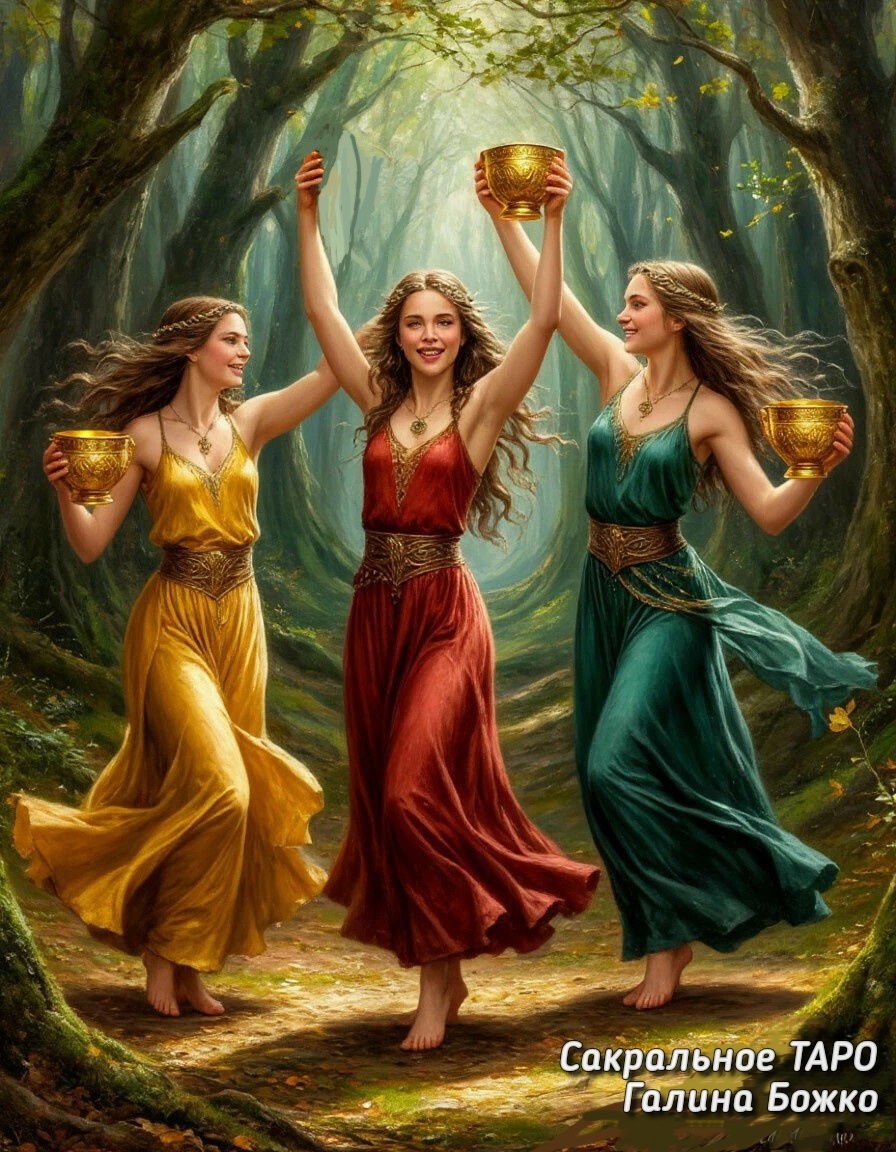 3 кубков Это одна из самых позитивных и радостных карт. Она несет хорошее настроение, оптимизм, легкость и удовлетворение. В делах вы можете достичь договоренностей по любым вопросам, добиться благоприятного развития ситуации и заработать. День или вечер оптимально провести в кругу приятных вам людей.
