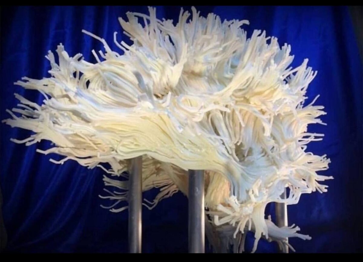 Белое вещество головного мозга, напечатанное на 3D-принтере.🧠 Белое вещество составляет примерно 40% от общего объема головного мозга человека. Оно состоит в основном из аксонов нервных клеток, покрытых миелиновой оболочкой, которая и придает ему характерный белый цвет. Миелин действует как изолятор, позволяя нервным импульсам передаваться быстрее и более эффективно. Важность белого вещества заключается в его роли как "проводной системы" мозга, соединяющей различные области серого вещества (где расположены тела нейронов) и обеспечивающей их взаимодействие. Исследования, посвященные составу мозга, подтверждают преобладание белого вещества.
