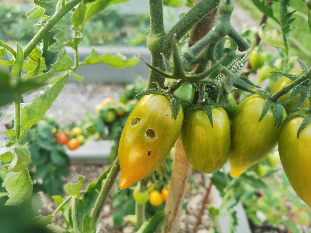 Помидорные Сосульки действительно сладкие и это оценил кто-то еще. Вот такие аккуратные дырочки стали появляться: Причем, черри не едят, только спелые Сосульки! Кто это может быть? Осы - их было бы видно днем. На малине сидят открыто, вообще не стесняются, объели всё! Вот кто главный вредитель малины поздних сортов. Кстати, желтую (Оранжевое чудо) вроде бы не трогают... надо еще понаблюдать Слизни? Выходила рано утром по росе - нет их там. Какие еще варианты? А помидоры черри в горшках я решила утилизировать. Завтра август, холодные росы и они решили, что все, хватит стараться: Первый урожай дали хорошо, а дальше не хотят. В грунте совсем другая картина - черри все зеленые и счастливые, требуют продолжения банкета лета, цветут и завязывают непрерывно: А с контейнерными я похоже поиграла и больше не хочу пока. Вершки потеряли вид, пасынки не растут, хотя с корнями полный порядок и жизнь в горшках кипит. Кроме червей, там еще обнаружился целый выводок личинок бронзовок. Бронзовки по