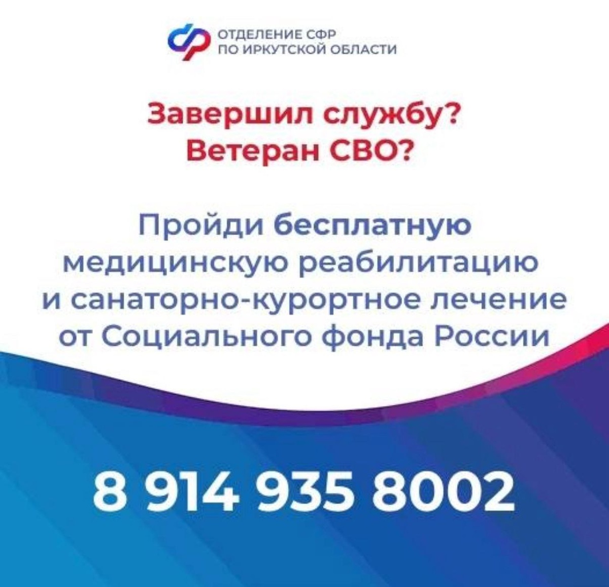 ‼️ Ветеранов СВО из Иркутской области приглашают бесплатно пройти реабилитацию или санаторно-курортное лечение в Центрах реабилитации Социального фонда России. Для этого нужно: ✅ Быть демобилизованным; ✅ Иметь удостоверение ветерана боевых действий; ✅ Иметь медицинские показания. 📅 Продолжительность реабилитации зависит от медицинских показаний, длительность санаторно-курортного лечения – до 21 дня. 🏡Всего на территории РФ работает 12 Центров реабилитации. Все учреждения имеют широкий профиль специализации – лечение заболеваний опорно-двигательного аппарата, нервной и сердечно-сосудистой систем, патологии органов дыхания и др. 👍 В Центрах созданы комфортные условия для восстановления и проживания, работает высококвалифицированный медицинский персонал, современное оборудование. ✈️ Отделение СФР по Иркутской области полностью возместит затраты на проезд к месту прохождения лечения и обратно любым видом транспорта: ✅ Поезд; ✅ Самолет; ✅ Водный транспорт; ✅Автобус; ✅Личный авт