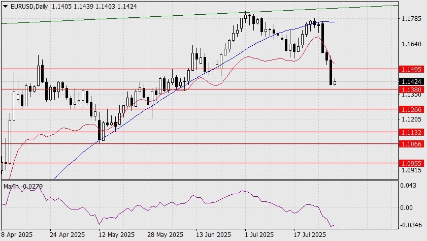 Паре EUR/USD до целевой поддержки осталось «полшага», а закрепление под ней откроет цель 1.1266. Но цель 1.1380 может быть определена ошибочно и цена сейчас отправится в коррекцию от минимума вчерашнего дня 1.1401. Но в любом случае цена находится в диапазоне консолидации 3-11 июня и закрепление над ним (1.1495) может открыть альтернативный сценарий. Причиной этому является устойчивость фондового рынка – фьючерсы на S&P500 развернулись в рост и уже близки к историческому максимуму 28 июля.