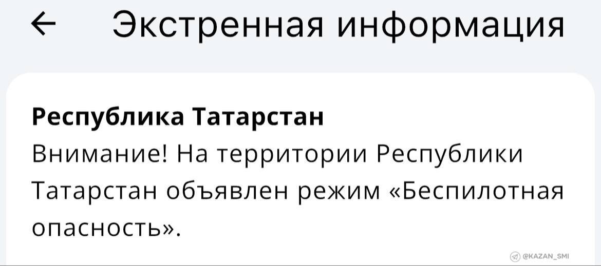 ⚡️ Режим «Беспилотная опасность» объявлен в Татарстане