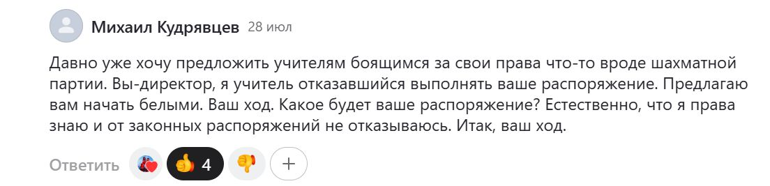 Сегодня на связи Михаил Кудрявцев. Разбираем вопросы от читателей. Назовём эту рубрику "Шах и мат для учителя". Итак, предложение от нашего штурмана Михаила Кудрявцева для учителей. Для учителей, которые видят и всё понимают, а если давно работают, то знают, как надо и как должно быть. И от этого им ещё сложнее держать удары от образования и выполнять часто неразумные требования. Что можно изменить в этом случае? Что этому мешает по пониманию добросовестного учителя? Первой вызвалась описать ситуацию с директором Елена Мусинова. Как она видит эту ситуацию. Хотя Елена не учитель и не директор, возможно мама. у которой дочь или сын работают в школе и она слышит эти разговоры каждый день дома. И видит состояние учителя и отношение к нему. Ситуацию вы поняли. Как можно надавить на такого учителя, который не идёт на контакт с администрацией? Часть первая. Расписание с окнами. Премии. Часть вторая. Профсоюз. Федеральный закон. Часть третья. Слон и Моська. А вам не надоело? Захотите м