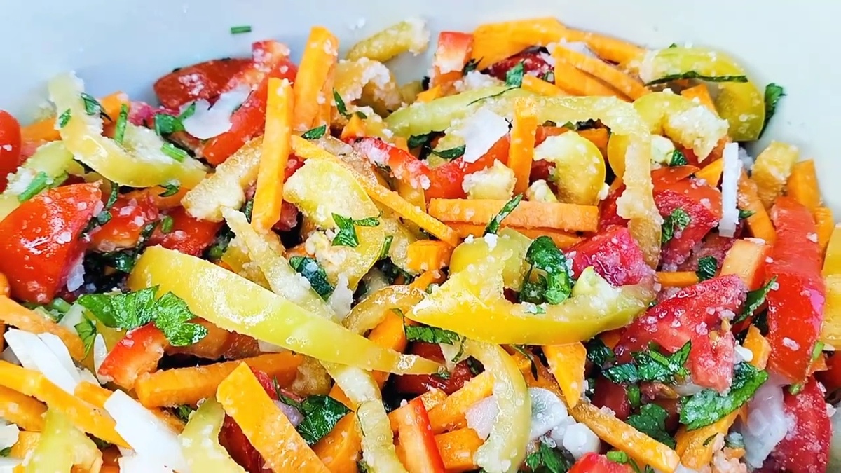 Затем все овощи перекладываю в глубокую миску. Можно взять их все примерно в равном количестве, а можно взять чего-то больше, а чего-то меньше. Самое главное взвесить нарезанную массу овощей у меня получилось ровно 1 кг.