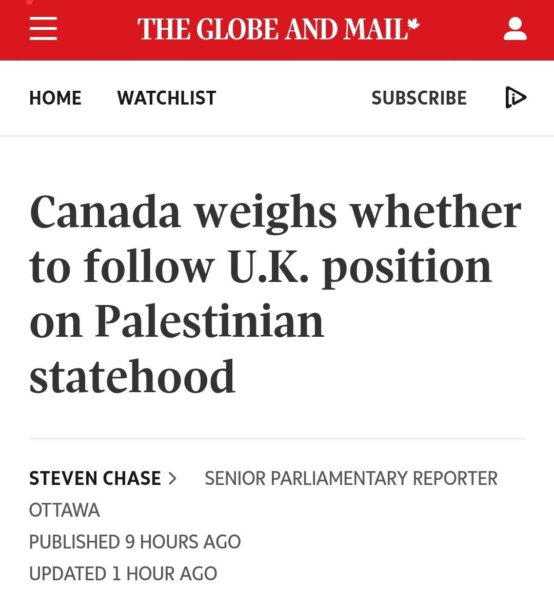 По данным канадских СМИ, правительство Канады изучает возможность официального признания Палестинского государства, если Израиль не согласится на перемирие в Газе.