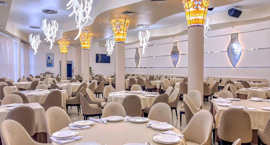 Реклама ООО «ТРОЛАКС» ИНН:7714105629 erid:2Vtzqw19rJL Что вас ждёт: • Элегантный интерьер. Зал оформлен в мягкой палитре оттенков слоновой кости и шампанского. Стильные кресла гармонично сочетаются с кремовыми скатертями, создавая атмосферу утончённого комфорта. • Нестандартное освещение. Авторские люстры в виде светящихся ветвей и витражные абажуры-колонны наполняют пространство тёплым, рассеянным светом, превращая любое торжество в настоящую арт-инсталляцию. • Простор без границ. Пространство идеально подходит для проведения крупных банкетов, свадеб и корпоративов. Круглые и прямоугольные столы легко трансформируются под формат мероприятия, при этом остаётся достаточно места для танцпола. В зале предусмотрена сцена для артистов и ведущих. • Современное оснащение. В наличии — профессиональные аудио- и видеосистемы, а также климат-контроль для комфортной атмосферы в любое время года. • Кухня. Шеф-повар предлагает как классические европейские блюда, так и авторские гастрономические поз