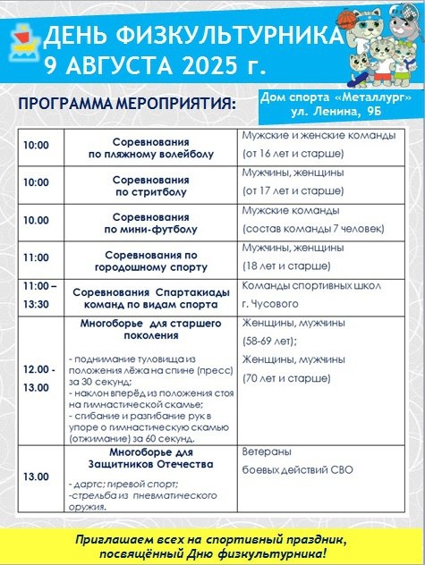 Приглашаем всех любителей физкультуры и спорта провести этот день активно и весело 9 августа на территории Дом спорта «Металлург» с 10:00 часов состоится спортивный праздник, посвященный Дню физкультурника!