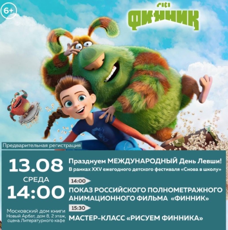 Московский дом книги на Новом Арбате, 2-й этаж, сцена Литературного кафе. 13 августа в Московском доме книги на Новом Арбате в рамках XXV ежегодного детского фестиваля «Снова в школу» состоится показ полнометражного анимационного фильма «Финник» и мастер-класс «Рисуем Финника». Международный день левши – неофициальный праздник, предпочтительно пользующимся левой рукой. Впервые его отметили в 1976 году, и с тех пор эта дата стала знаменательной. Для вас мы подготовили: В 14:00 состоится показ российского полнометражного анимационного фильма «Финник» режиссёра Дениса Чернова о добром и озорном домовом. Вы увидите детский детектив от создателей «Смешариков» о приключениях девочки Кристины и хранителя домашнего очага Финнике Родителям регистрация не требуется, для детей регистрация обязательна по ссылке: https://mos-dom-knigy-events.timepad.ru/event/3481403/#register Приятным бонусом мероприятия станут подарки! 🆓Бесплатно Подробнее ЗДЕСЬ 👨👩👧👦 @Together_with_kids Пост носит