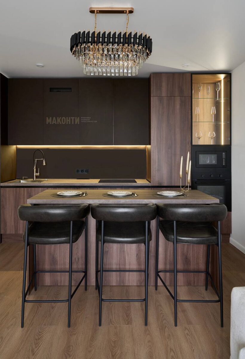 Темная кухня с островом 🖤#маконти_проекты Особенности: ⚫Фасады: темные суперматовые фасады + ЛДСП Egger под дерево + стекло ⚫Фасады, стеновая панель и столешница из одного материала: турецкий пластик — новинка на российском рынке!🔥Есть большой выбор как однотонных, так и необычных декоров ⚫Корпус: нестандартный цвет ЛДСП Egger под фасады ⚫Фурнитура: tip-on, DTC ⚫Подсветка над рабочей зоной с сенсорным датчиком ⚫Подсветка витрины. Черная алюминиевая рамка витрины отлично сочетается со встроенной техникой ❤️ ⚫Духовка и СВЧ в одном пенале ⚫Столешница с увеличенной глубиной, фактура и декор под камень ⚫Остров с вместительным хранением Видеообзор данного проекта смотрите здесь. Консультация с дизайнером, расчет проекта, создание 3D визуализации, запись в шоу-рум: @makonti_mf | 88001018853