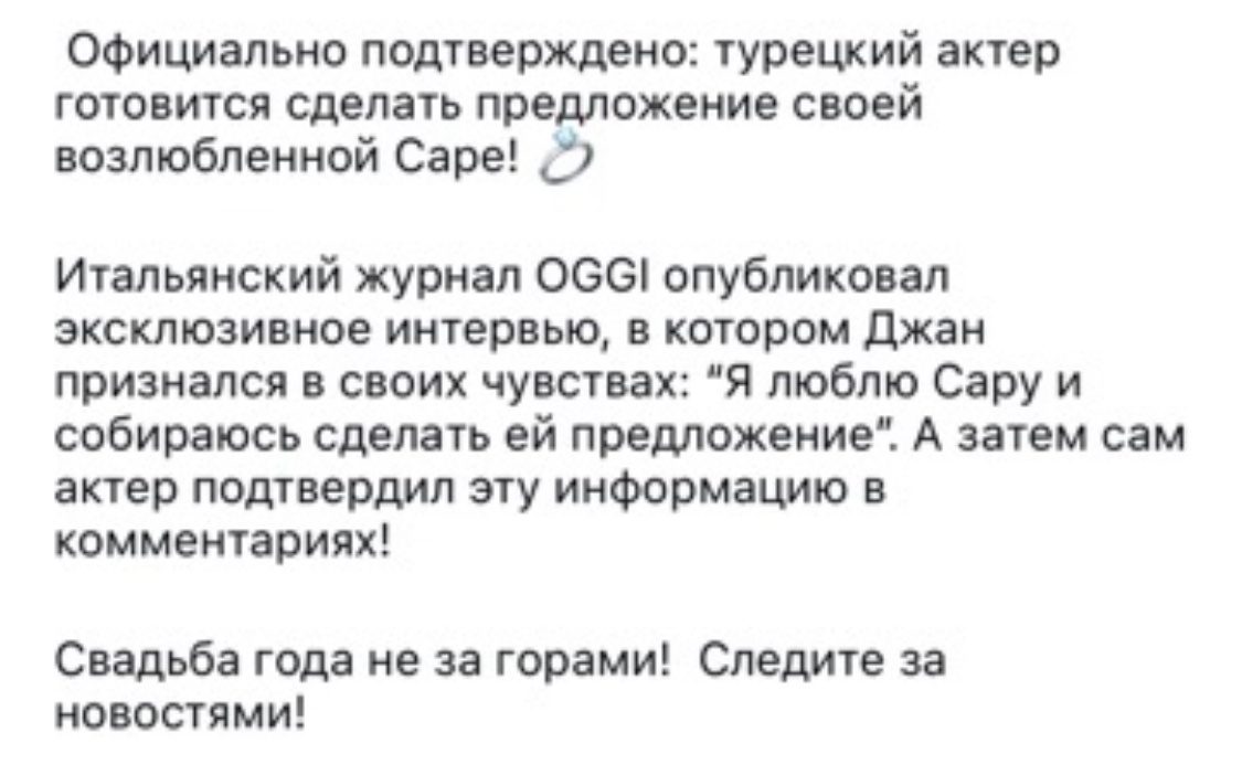 Приветствую вас, мои медовые розы! 🌹💖 Обычно я пишу вам новости каждый день, а тут немного пропала. Везде что-то происходит, вот и с платформой тоже: совсем нет показов🤷♀️ Но это такая мелочь из всего возможного, что я была бы рада, если бы все ограничилось только этой проблемой. Не знаю, кто вообще увидит мою нынешнюю сводку новостей, но так привыкла к вам, что решила выйти на связь😉💖 ✅ Главная новость номер раз, которая облетела все паблики, это конечно свадьба Джана Ямана. Фан клуб Женьки желает ему всяческого счастья, но большинство комментариев в сети отрицательные. Дело в том, что избранница Ямана, «без году как неделя» проходила в его девушках, и вот те раз,🤷♀️ уже свадьба. Да и сама Сара Блюма вызывает у многих противоречивые чувства. Она диджей, а это значит постоянные ночные вечеринки в клубах, алкоголь и сигары.. да и скандал с бывшим Сары, отцом ее сына, добавляет дров. Мужчина пытается ограничить встречи матери и ребенка, а в ответ, Сара выложила в сеть расква
