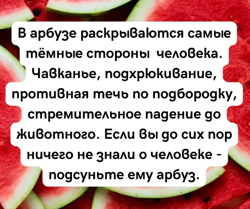 И помните: то, как вы едите арбуз, многое о вас говорит. Особенно, если вы чавкаете, хрюкаете, и сок струится по подбородку… Но не вздумайте чувствовать неловкость, ведь это звуки настоящего счастья и отличного настроения 🍉😄😄