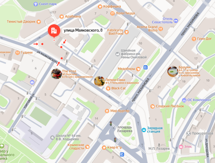 На карте снизу можно увидеть ещё одну остановку. Она называется «Магазин Черноморочка». Если ехать со стороны Камышовой бухты, то нужно выйти на этой остановке, перейти дорогу и идти по улице Маяковского.