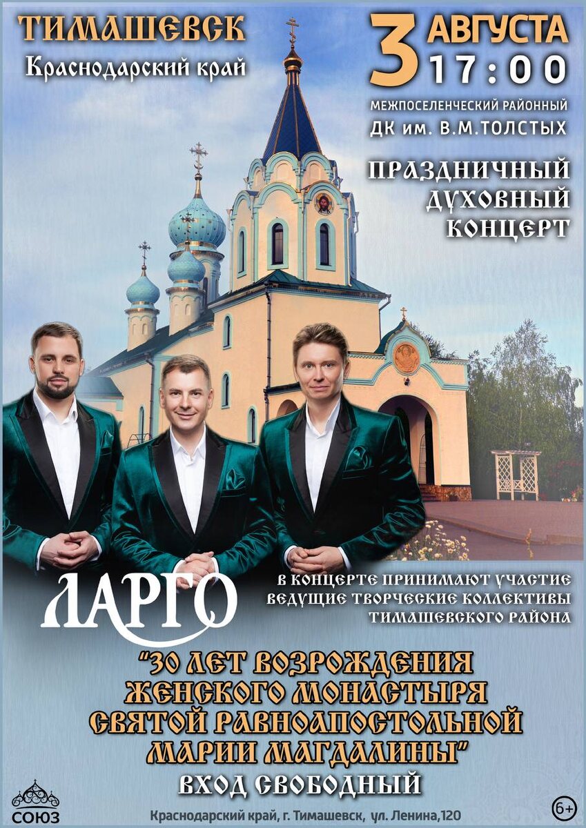 ДОРОГИЕ! Хотим напомнить вам, что 3 августа в 17:00 в районом Доме культуры им. В.М. Толстых (г. Тимашевск, ул. Ленина, 120) состоится особенный концерт, посвящённый 30-летию возрождения женского монастыря святой равноапостольной Марии Магдалины! В программе: 🔹Выступление арт-группы «Ларго», визитной карточкой вокального коллектива является исполнение духовных песен и псалмов 🔹Яркие номера от лучших творческих коллективов Тимашевского района. Вход свободный! Ждём встречи!