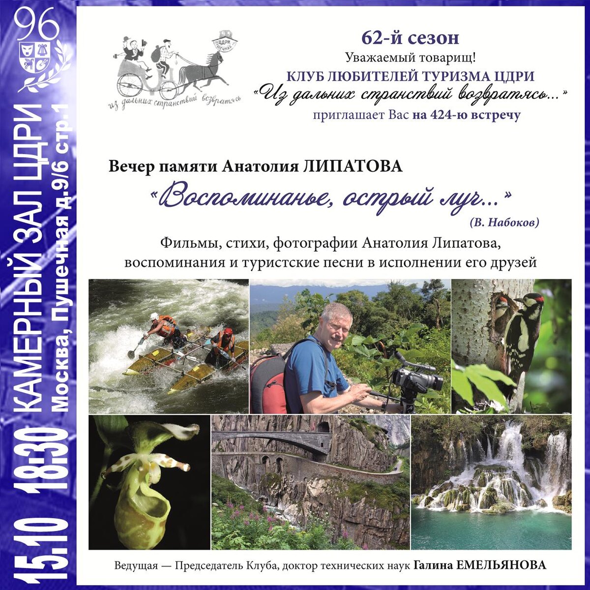 приглашает на 424-ю встречу «Воспоминанья, острый луч…» — памяти Анатолия ЛИПАТОВА Фильмы, стихи, фотографии Анатолия Липатова, воспоминания и туристские песни в исполнении его друзей. Ведущая — Председатель Клуба, доктор технических наук Галина ЕМЕЛЬЯНОВА 15 октября, среда 18:30